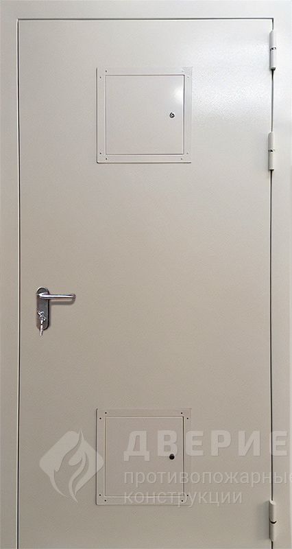 Эта противопожарная металлическая дверь сделана для тех зон, где важно не только выдержать пожар, но и иметь быстрый доступ к инженерным соединениям. В полотне предусмотрены два встроенных ревизионных люка: верхний и нижний. Через них удобно обслуживать стыковочные узлы, проводить проверку и мелкий ремонт, не снимая дверной блок и не разбирая проём.