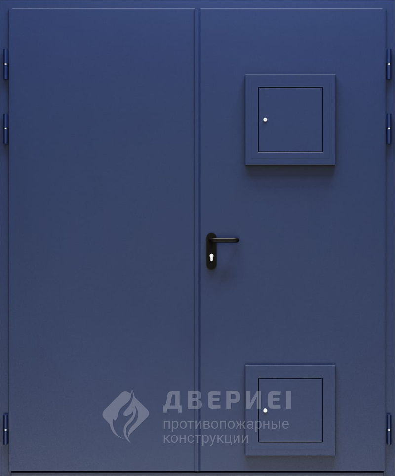 Синяя двухстворчатая противопожарная дверь EI-60 рассчитана на объекты, где важны и огнезащита, и удобный доступ к инженерным точкам. На рабочей створке установлены два стыковочных узла в виде аккуратных накладных люков: нужные соединения и точки контроля всегда под рукой, а проём выглядит собранно.